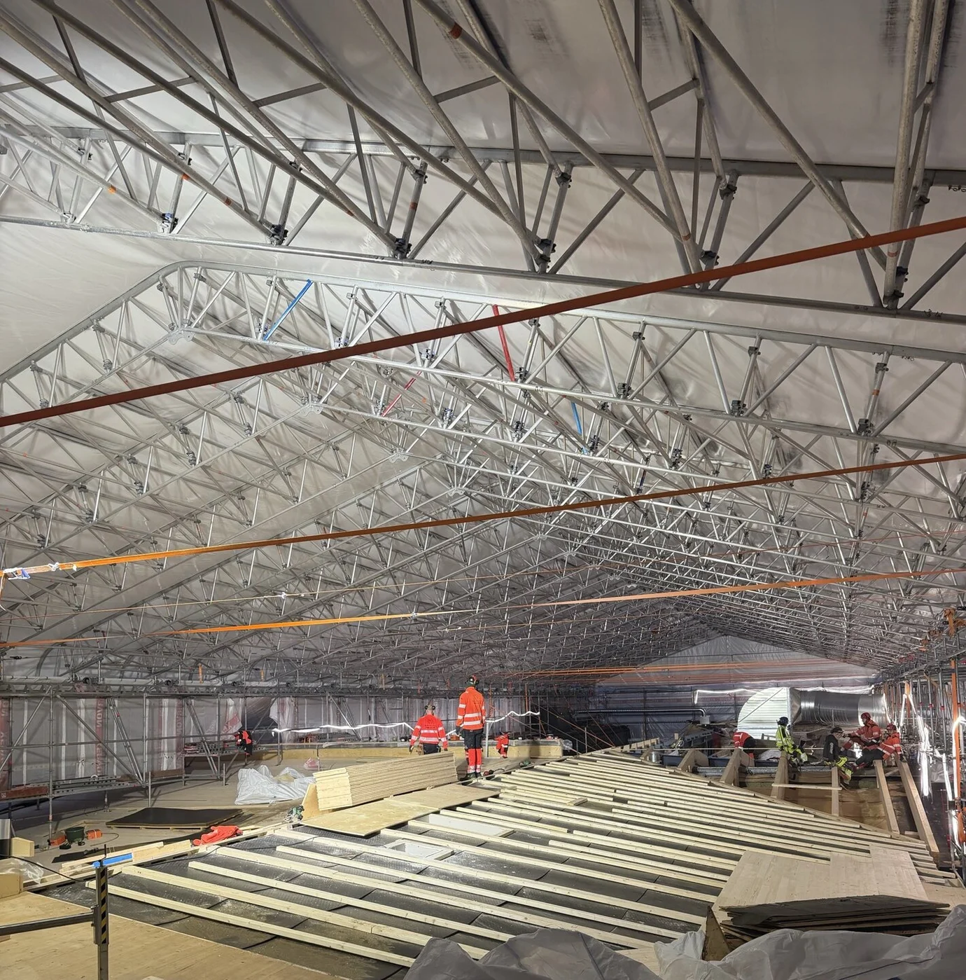 ”En betydande del av ställningen har uppförts invändigt på balkar, eftersom bjälklaget inte klarat det punkttryck som traditionella spirorna medför. Därefter har ställningen förts vidare genom taket för att kunna sammanfogas med övriga delar av konstruktionen” säger Erik.